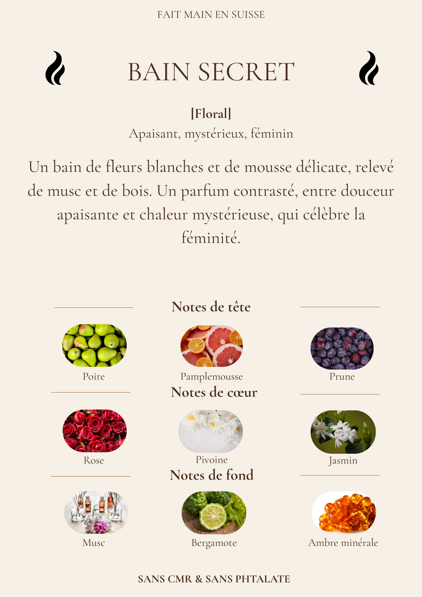 Un bain de fleurs blanches et de mousse délicate, relevé de musc et de bois. Un parfum contrasté, entre douceur apaisante et chaleur mystérieuse, qui célèbre la féminité.